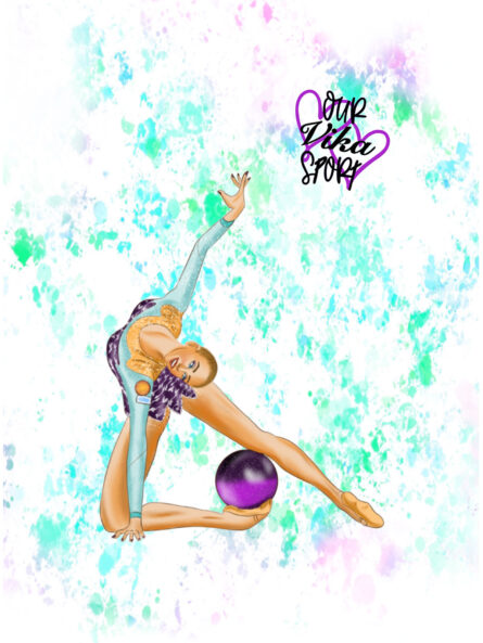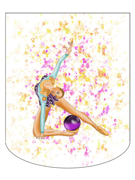 Funda de pelota en tejido sublimado resistente, con forma redondeada en la parte inferior, diseño exclusivo de gimnasia rítmica y opción de personalización con nombre.