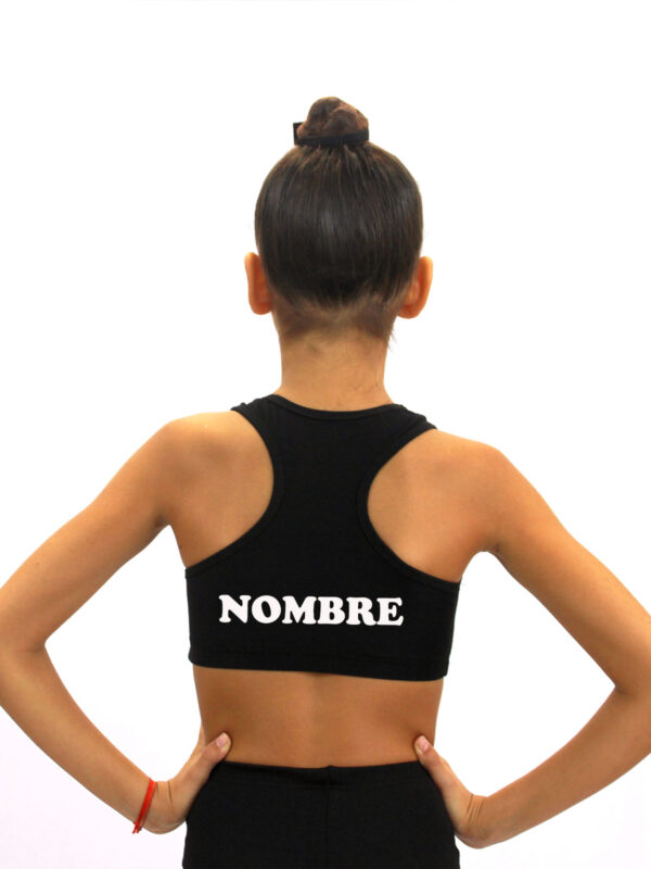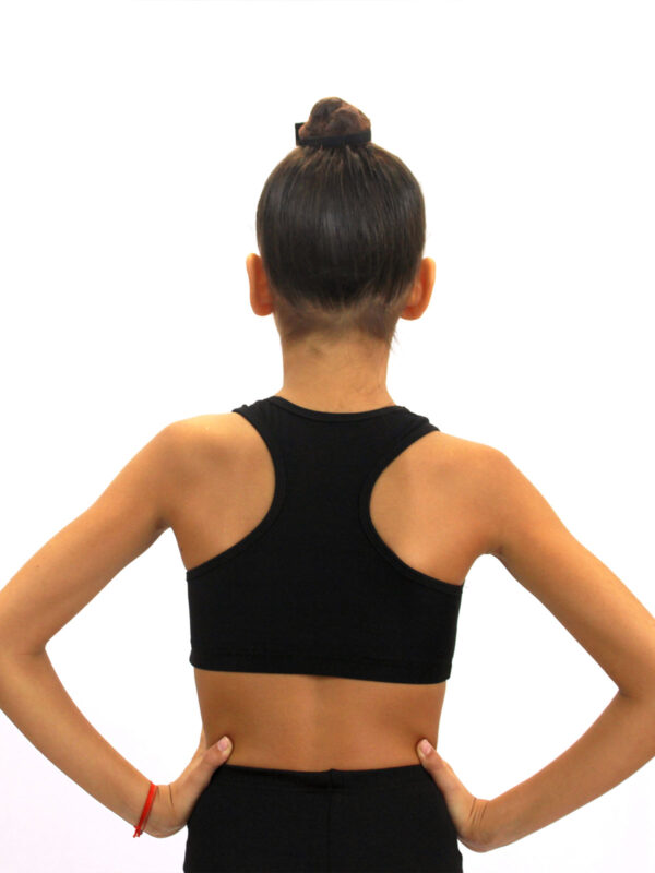 Este top está confeccionado en punto de algodón nacional de alta calidad, garantizando suavidad, resistencia y transpirabilidad. Su diseño de espalda nadadora proporciona un ajuste seguro y cómodo, permitiendo total libertad en los hombros y la espalda, ideal para los entrenamientos de gimnasia rítmica, danza, yoga o fitness. El color negro clásico lo convierte en una prenda versátil y fácil de combinar, mientras que su confección propia asegura un acabado cuidado y único. Es la prenda perfecta para quienes buscan comodidad, estilo y funcionalidad en un solo top